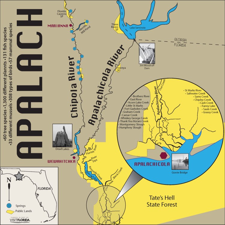 This design for the Florida Paddling Trails Association shows points of interest and feeder creeks along the Apalachicola River in Florida.