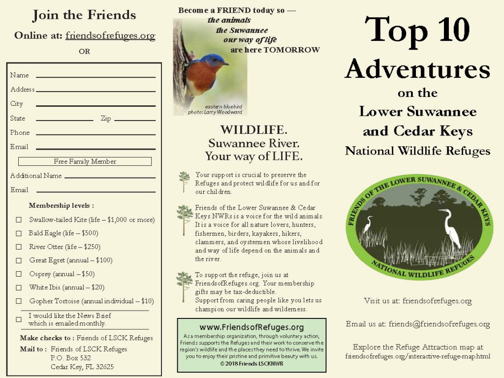 This tri-fold brochure shows points of interest in the Lower Suwannee and Cedar Keys National Wildlife Refuges (LSCKNWR) and includes a membership application on the back cover.