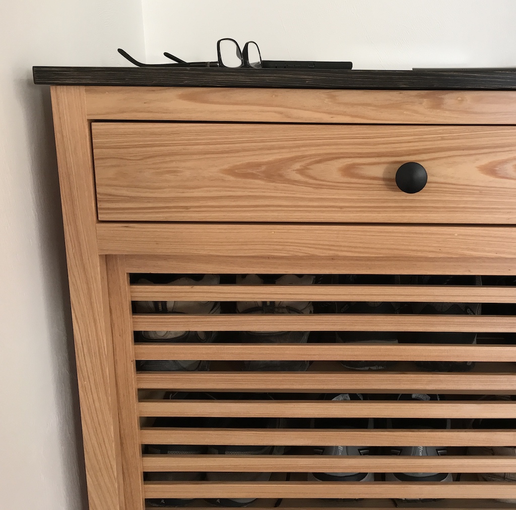 In Japan we learned how practical it is to store your shoes near the door. This cabinet combines shoe storage with a drop zone for phones, keys and mail as well as a charging station. All our shoes fit into this cabinet so we never carry shoes from the door to the closet.