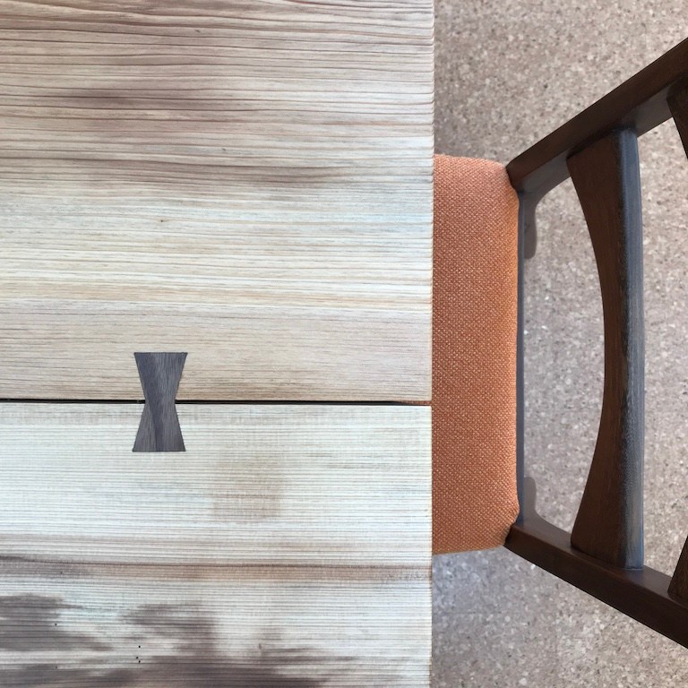 Cypress slabs are joined with walnut butterflies, angled on the edges and sealed with a hard-wax finish. The legs are steel.