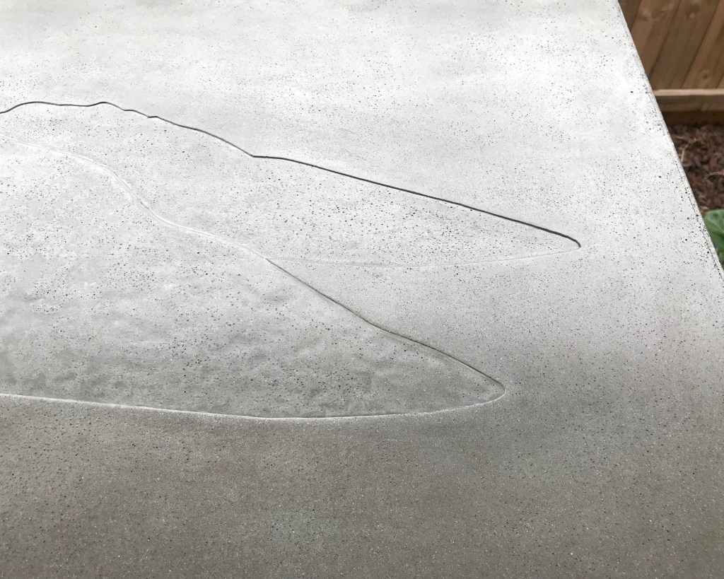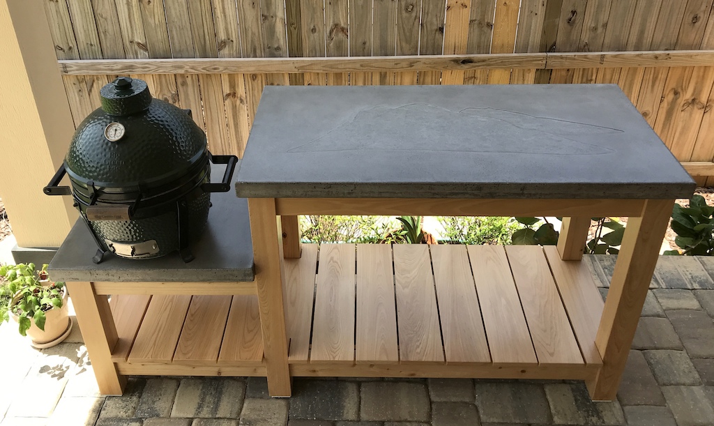 Our neighbors needed a sturdy Green Egg table so David and I jumped at the chance to use concrete and cypress again. This form was much simpler without the sink cutout so to make it more challenging we personalized it with an embedded mountain range. Our neighbors are avid hikers.
